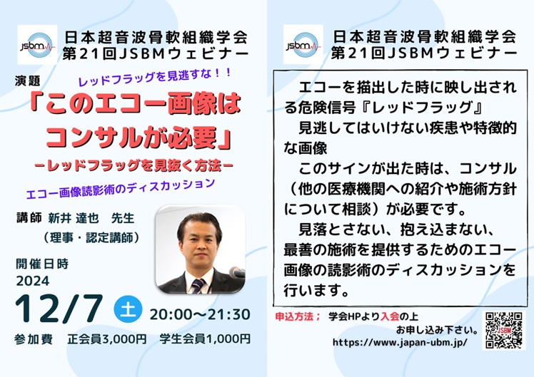 今般、超音波骨軟組織学会(JSBM)より一般公開WEBセミナーが12月7日(土)に開催されます。ご興味のある方はこちらからお申込み下さい。※セミナーご出席の座長・パネリストは当会会員の方々です。