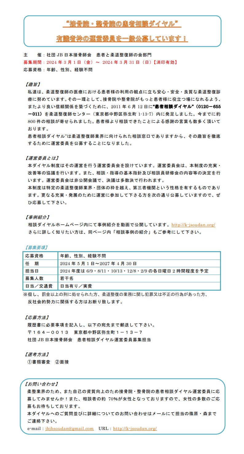 2024.3.1”接骨院・整骨院の患者相談ダイヤル”運営委員(有識者枠)を一般公募しています!